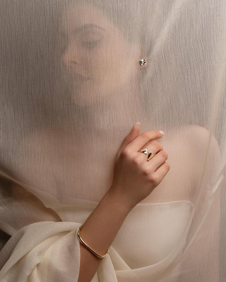 Kruta narukvica cetvrtastog oblika, minimalistički prsten i naušnice u 14 kt zlatu